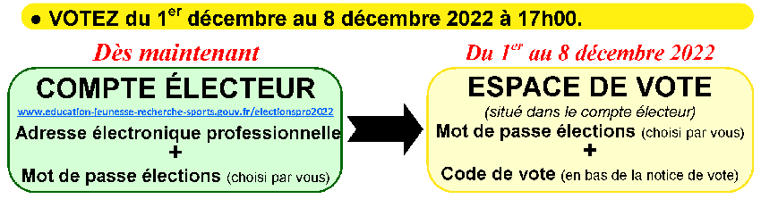 - Je n'ai pas reçu la notice de vote. - Si vous n'avez pas reçu la notice de vote contenant votre code de vote, vous pouvez demander à recevoir par voie électronique jusqu’au 8 décembre avant 17h00 un nouveau code de vote (qui invalidera le précédent) en vous connectant à votre compte électeur. - Connectez-vous au portail élections : www.education-jeunesse-recherche-sports.gouv.fr/electionspro2022 - Saisissez votre identifiant (votre adresse électronique professionnelle) et le CAPTCHA. - Saisissez votre mot de passe électeur (vous devez préalablement avoir activé votre compte électeur). - Cliquez sur "Consultez les scrutins, les candidatures et voter". - Sur la page vous demandant de saisir votre code de vote, cliquez sur "Cliquez ici pour obtenir un réassort de votre code de vote". - Choisir "Répondre à votre question Défi avec votre réponse secrète : cliquez ici". - Il vous sera demandé : - la réponse (que vous avez choisie) à la question défi (choisie par vous) lors de l'activation de votre compte électeur. - et votre NUMEN - Si vous ne connaissez pas votre NUMEN, il existe une procédure extrêmement simple et rapide pour l'obtenir. Suivez le tutoriel réalisé par le SIES. - Il vous sera demandé de choisir de recevoir le lien d'activation de la demande de code de vote soit par SMS, soit par mail (sur votre messagerie électronique personnelle : adresse mail différente de l'adresse électronique professionnelle). - Vous recevrez un mail (ou un SMS) contenant un lien permettant de régénérer le code de vote. - Le nouveau code de vote ne sera visible que durant 120 secondes. Aussi, avant de cliquer sur « régénérer mon code de vote », munissez vous d’un moyen de le conserver : crayon et papier ou mieux appareil photo de votre smartphone. Passé cette durée, si vous ne l’avez pas noté ou photographié, il faudra recommencer toute la procédure afin d’obtenir un nouveau code. Si vous avez des questions ou si vous rencontrez une difficulté, contactez les responsables du SIES par téléphone ou mail : 06 80 13 44 28 / 06 30 58 86 54 / jean-baptiste.verneuil@wanadoo.fr
