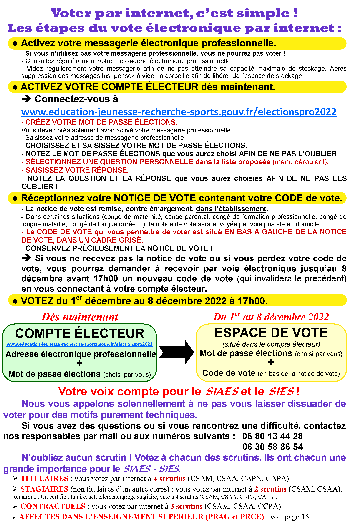 - Activez votre compte électeur. Connectez-vous à www.education-jeunesse-recherche-sports.gouv.fr/electionspro2022 - Créez votre mot de passe élections. Vous devez préalablement avoir activé votre messagerie professionnelle. - Saisissez votre identifiant. Il s'agit de votre adresse de messagerie professionnelle. - Créez (choisissez) votre mot de passe élections en suivant les consignes (nombre de caractères etc.), puis saisissez-le. - NOTEZ LE MOT DE PASSE élections que vous aurez choisi AFIN DE NE PAS L’OUBLIER ! - Sélectionnez une question personnelle dans la liste proposée (menu déroulant). - Saisissez votre réponse. - Notez la question et la réponse que vous aurez choisies AFIN DE NE PAS LES OUBLIER ! - Si vous avez oublié le mot de passe élections que vous avez choisi lors de l'activation de votre compte électeur, vous pouvez demander à recevoir par voie électronique jusqu’au 8 décembre avant 17h00 un nouveau mot de passe élection. Si vous avez des questions ou si vous rencontrez une difficulté, contactez les responsables du SIES par téléphone ou mail : 06 80 13 44 28 / 06 30 58 86 54 / jean-baptiste.verneuil@wanadoo.fr