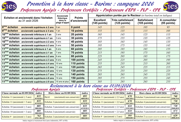 La position du SIES : Les nouvelles règles et le nouveau barème découlant du protocole PPCR ont généré de très importants bouleversements dans le classement des candidats. Certains candidats non promus en 2017 avec un barème inférieur de quelques points ou de quelques dixièmes de points au barème du dernier promu, qui s’attendaient légitimement à être promus en 2018, ont été relégués dans les profondeurs du classement, perdant ainsi tout espoir d’être promu avant deux, trois ans, voire plus. Du fait de l’entrée en vigueur de ces nouvelles règles, de nombreux professeurs ont subi une diminution injustifiée et inacceptable de l’appréciation Recteur entre 2017 et 2018. Des centaines de candidats ont perdu les points liés aux services effectués dans un établissement relevant de l’éducation prioritaire et/ou les points liés au rythme d’accès à l’échelon détenu actuellement (grand choix ou choix). Les notes administratives et pédagogiques ne sont plus prises en compte. Notre carrière a été balayée d’un revers de manche par les syndicats signataires du protocole PPCR ! Nombreux sont les professeurs qui ont été lourdement pénalisés par les modalités absurdes d’évaluation par compétences dans le cadre du rendez-vous de carrière. Avoir « Excellent » à tous les items ne garantit pas de bénéficier de l’appréciation « Excellent » du Recteur. Avoir « Très satisfaisant » à tous les items ne garantit pas de bénéficier de l’appréciation « Très satisfaisant » du Recteur. Avoir « Satisfaisant » à un item et « Excellent » ou « Très satisfaisant » aux dix autres items peut priver le professeur de l’appréciation « Très satisfaisant » du Recteur. L’appréciation portée par le Recteur en 2018, 2019, 2020, 2021, 2022, 2023, 2024 ou en 2025 (suite au 3ème rendez-vous de carrière) n'est pas modifiable et est conservée pour les campagnes de promotions successives jusqu'à ce que le professeur soit promu. Le SIES conteste particulièrement cette disposition du nouveau barème qui pénalise pour plusieurs années de nombreux professeurs privés de possibilité d’évolution, voire victimes d’une injuste baisse d’appréciation. N’en déplaise à ceux qui affirment qu’il ne faut pas comparer les appréciations Recteur attribuées en 2017 à celles attribuées en 2018 et aux syndicats (SNES-FSU, SE-UNSA, SGEN-CFDT, SNEP-FSU) qui ont approuvé le protocole PPCR et qui ont négocié le nouveau barème pour la promotion à la hors classe, il s’agit bien d’un préjudice moral et financier qui affecte des milliers de professeurs dans chaque académie. Le SIES dénonce depuis 2016 les fondements idéologiques du protocole PPCR et n’a jamais cessé de dénoncer et de combattre ses conséquences catastrophiques sur la carrière des professeurs. L’accès à la hors classe et l'avancement d'échelon, prévus dans la progression de carrière des fonctionnaires, n'ont malheureusement plus vocation à constituer une amélioration du niveau de vie des personnels ; ils atténuent seulement la régression du pouvoir d'achat qu’ils subissent. Après des années de "gel" de la valeur du point d’indice, une revalorisation globale et significative des traitements est nécessaire. Ni l’indigente augmentation de la valeur du point d’indice, ni l’ajout de quelques points d’indice aux grilles indiciaires des différents corps (dans le cadre du protocole PPCR) ne compensent cette perte de revenus. Le SIES revendique à la fois l’augmentation de la valeur du point d’indice et la revalorisation de la grille indiciaire des professeurs, dont celle des Agrégés, sans aucune contrepartie. Pour le SIES cela ne saurait s’accompagner d’une modification des statuts et des obligations règlementaires de service des enseignants, d’une dénaturation de leurs missions, ou d’atteintes à leur liberté pédagogique. En effet, pour le SIES, la mission première des professeurs consiste à instruire les élèves dont ils ont la charge en leur transmettant des savoirs et des savoir-faire. Le contingent de promotions à la hors classe est insuffisant et doit être augmenté significativement afin de permettre à l’ensemble des Agrégés ayant fait une carrière complète dans l’éducation nationale d’être admis à la retraite en ayant bénéficié de cette promotion. Pour le SIES, le "mérite" n’est pas un gros mot. La méritocratie est un des fondements de la révolution française et de notre république. Le SIES défend l’élitisme républicain. Nous estimons que le travail de chacun doit être reconnu à sa juste valeur. C’est d’ailleurs ce que réclament les professeurs, les CPE, et plus largement l’ensemble des fonctionnaires. Ils sont attachés à la reconnaissance de leur travail quotidien et de leur investissement tout au long de leur carrière. Le SIES est donc opposé à un système de promotion « tout à l’ancienneté », basé de façon dogmatique et stalinienne sur la date de naissance des professeurs. Le SIES estime normal que l’ancienneté soit prise en compte, mais il ne récuse pas pour autant le « mérite », car le travail de chacun doit être reconnu à sa juste valeur. Cela à l’expresse condition que le « mérite » soit apprécié sur des critères objectifs et indiscutables, ce qui est loin d’être toujours le cas. Le « phénomène de cour » doit être évité, tout comme l’arbitraire. Trop d’avis restent ainsi sujets à caution, et particulièrement pour celles et ceux qui, susceptibles d’être promus, ne le sont pas par suite d’un avis qui les pénalise lourdement et sur lequel un doute peut être émis.